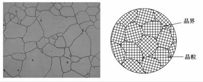 將實際使用的金屬材料制成試樣,在顯微鏡下觀察,可以看到它是由許多小晶體組成的,這種外形不規則的小晶體稱為晶粒,晶粒與晶粒之間的界面稱為晶界。多晶體中,雖然每個晶粒和單晶體一樣具有各向異性,但一塊金屬包含有大量彼此位向不同的晶粒,不同方向的金屬性能都是許多晶粒性能的平均值,故一般金屬具有各向同性特征。實際金屬的顯微組織照片和多晶體結構示意圖如圖1.2.2所示。