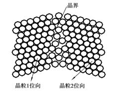 面缺陷通常是指晶界。實際金屬材料都是多晶體結(jié)構(gòu),在多晶體中兩個相鄰晶粒之間的晶格位向是不同的,所以晶界處的原子的排列是不規(guī)則的,它是從一種位向逐漸過渡到另一種位向的過渡層,如圖1.2.5所示。由于晶界處的原子排列不規(guī)則,使晶格處于畸變的狀態(tài),因而在常溫下晶界對金屬的塑性變形起阻礙作用,即晶界處有較高的硬度和強度。當晶粒越細小時,晶界的面積越多,對金屬塑性變形的阻礙越大,金屬的強度和硬度也越高。此外,晶界處原子擴散速度較快,熔點低和容易被腐蝕等。